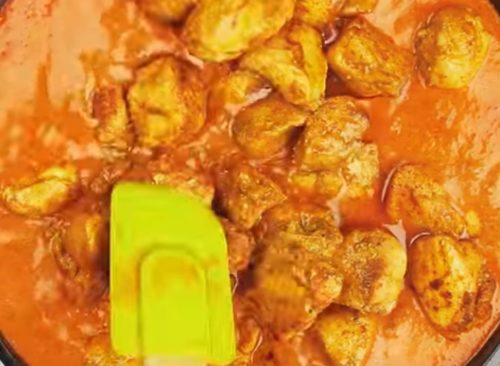 6. Теперь переложите в сковородку с соусом обжаренные кусочки курицы, все размешайте и накройте крышкой. Тушите под крышкой на среднем огне еще 15 минут.