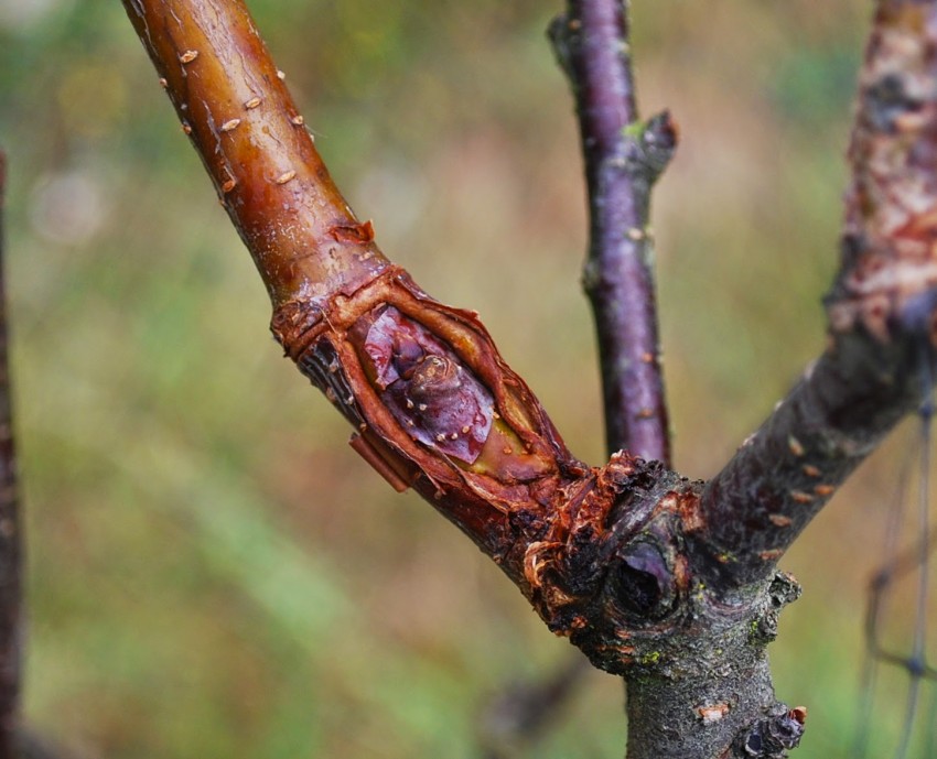 - на стволе во множестве образуются микротрещины, из которых сочится камедь;