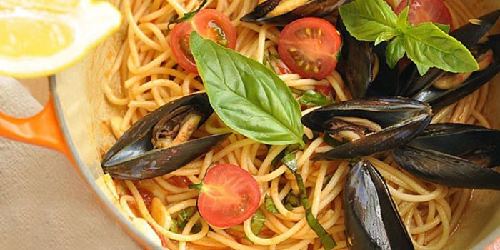 Иногда мидии в сливочно-чесночном соусе готовят с пастой, получается вкусно и питательно. Томаты и смесь жгучих перцев придадут блюду пикантные нотки. Соус из сливок и чеснока с морепродуктами можно сделать отдельно, перед приготовлением спагетти, и добавить уже при подаче к столу. Макаронные изделия для пасты выбирайте твердых сортов. На упаковках таких спагетти есть маркировки: «группа A», «пшеница твердых сортов» или «durum».