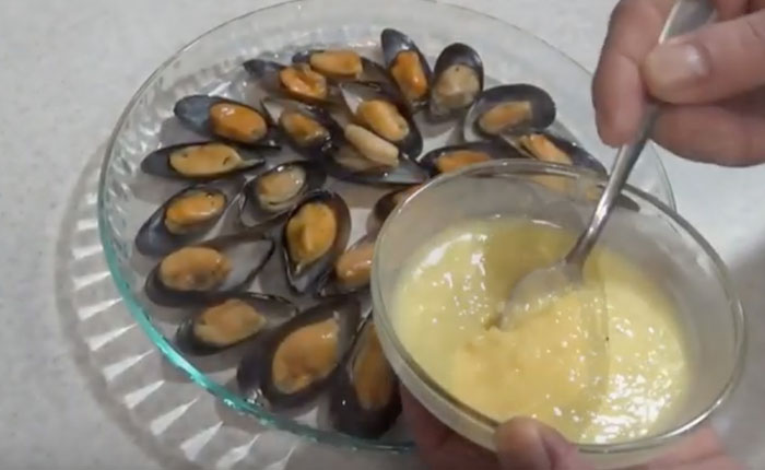 Отварные мидии в сливочно-чесночном соусе с сыром