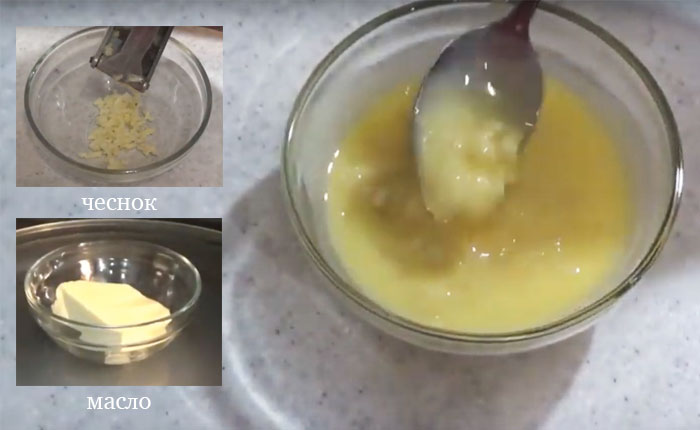 3. Чеснок измельчите в прессе, масло растопите до жидкого состояния, а твердый сыр натрите на мелкой терке. В масло выложите чеснок и тщательно размешайте ложкой.