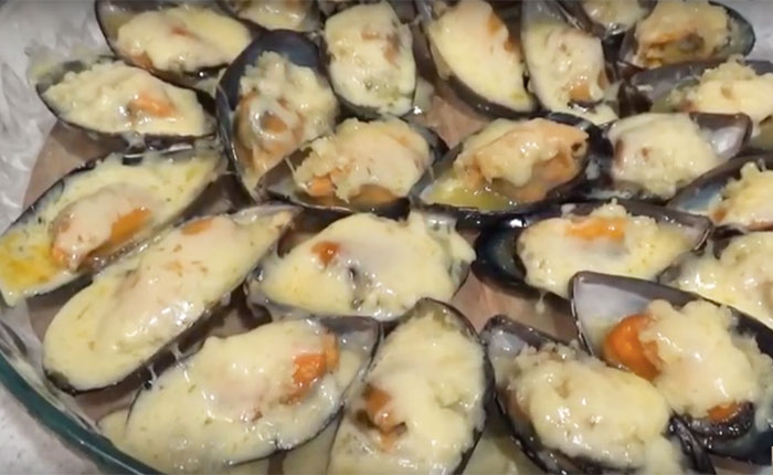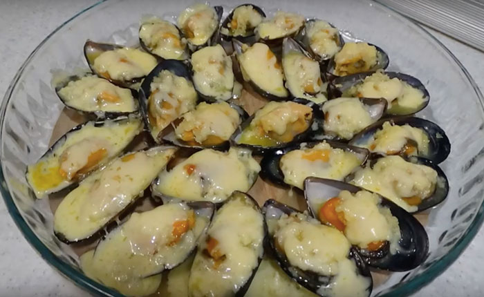 Мидии в сливочном соусе под сыром в раковинах в духовке