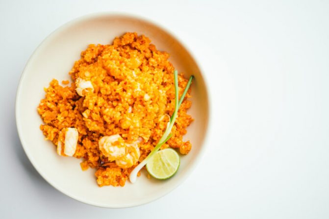 - Когда рис будет готов, добавьте соль, перец, кинзу. Если будет необходимо, добавьте еще немного бульона и морепродукты.