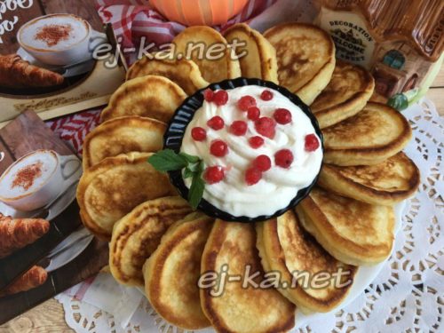 - Из теста консистенции густоватой сметаны в большом количестве растительного масла нажарьте пышные оладушки.
