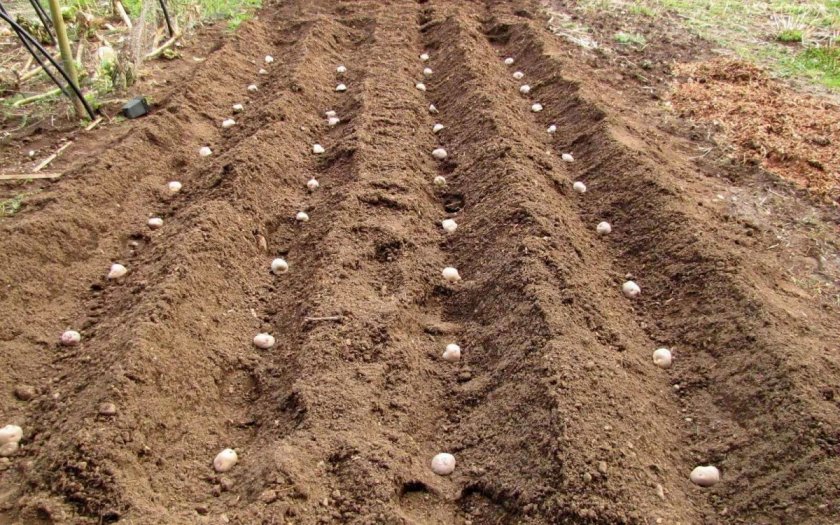 Если используется гребневый вариант посадки (формируются грядки), тогда в одной грядке размещают целых два ряда. В такой ситуации ряды размещают на дистанции в 19-26 см. Каждые последующие два рядка отделяют канавкой, имеющей ширину одной лопаты. Стенки этой канавки должны быть отлогими.
