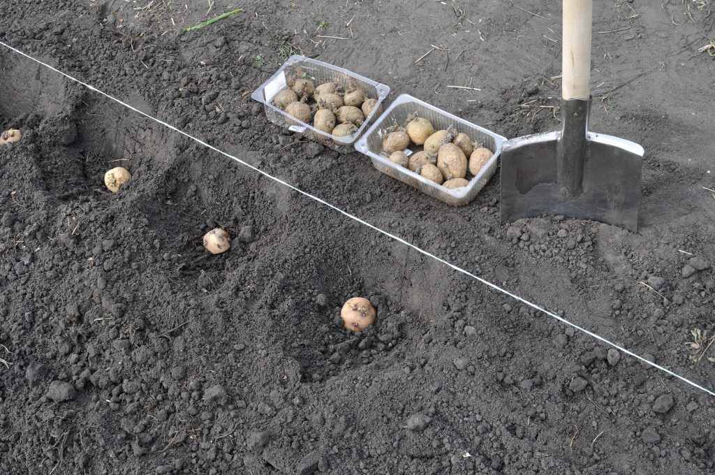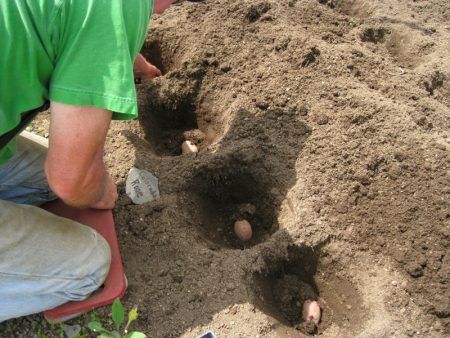 Во время высадки картофель следует располагать ростками вверх. При линейном расположении корнеплодов проще всего для разметки использовать доску. Стоя на ней, выкапывают ряд лунок, высаживают клубни, передвигают доску на расстояние, подходящее для междурядий. После этого предыдущий ряд присыпают землей. Так можно получить ровные ряды растений.