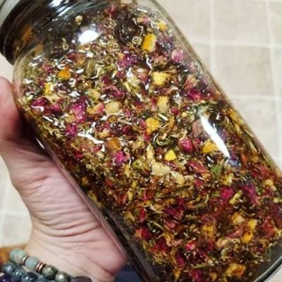 - Полученная смесь (порошок) заливается спиртом. На поллитра спирта берется две ложки сухого состава.