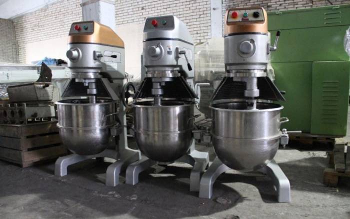 - Миксер. Данное оборудование по принципу работы схоже с тестомесом, но при этом комплектуется венчиком, который позволяет придать массе воздушность. Объем дежи варьируется в диапазоне от 4,8 до 150 л. При помощи миксера взбиваются бисквитные массы, крема, муссы, зефирные массы и т. д. Большая часть миксеров комплектуется насадками «спираль» и «лопатка», что позволяет также вымешивать тесто, не насыщая его воздухом — к примеру, заварное. Не рекомендуется вымешивать в миксере тесто круче мягкого сдобного.