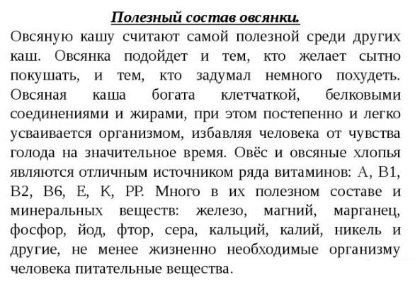 По структуре овсяные хлопья – это те же грубые пищевые волокна, при попадании в желудок они постепенно впитывают жидкость и разбухают. При дальнейшем движении по желудочно-кишечному тракту они впитывают шлаки, токсины, производят очистку организма. В составе овсянки есть клетчатка, которая положительным образом влияет на метаболизм, улучшает пищеварение.