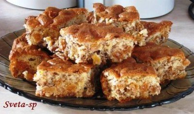 Еще теплый пирог нарезать квадратами или ромбами. Подавать пирог полностью остывшим (особенно вкусно с молоком). Приятного аппетита!
