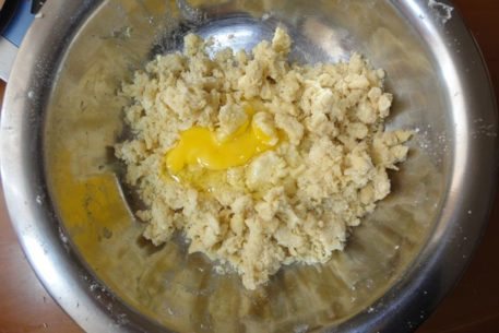 Просеиваем муку на доску или в мелкое большое блюдо. На муку выкладываем нарезанное мелкими кусочками холодное сливочное масло. Быстро руками перетираем продукты, добиваясь того, чтобы смесь стала похожей на мелкую крошку. Затем добавляем сахарный песок и перемешиваем.