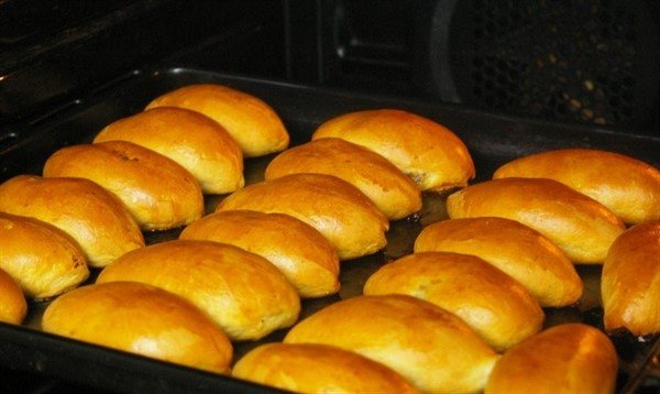 - Выкладываем все заготовки на противень, смазываем тонким слоем взбитого яйца и отправляем в разогретую духовку. Для полной готовности понадобится минут 30. После чего пирожки остужаем и подаем к столу.