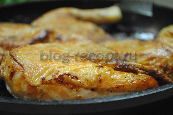 Однако непосредственно перед выкладыванием в сковороду, цыпленка можно смазать смесью из двух чайных ложек аджики и трех – сметаны.