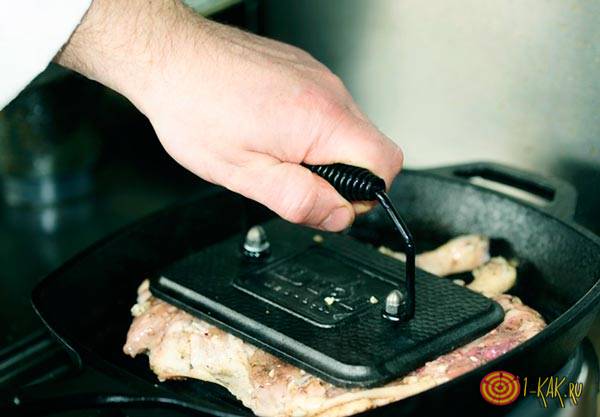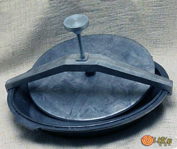 , сделанная из чугуна и имеющая ребристое дно. Вес ее примерно 8 килограммов, все зависит от размера. Главная ее особенность — тяжелая крышка, выполняющая функции пресса. Она плотно прижимает продукт сверху во время приготовления. Многие хозяйки за неимением такой посуды используют обычные сковороды и ставят сверху тяжелые предметы: банку с водой или камень.