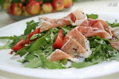 Грибы порезать на небольшие дольки. Лук нарезать полукольцами. В небольшом количестве разогретого оливкового масла спассеровать грибы, слегка посолив, затем к ним добавить лук и готовить до легкой пассеровки лука. За это время грибы полностью будут готовы, а лук впитает аромат грибов и останется пассерованным. Помидорки черри разрезать на половинки. Ветчину порвать/порезать на средние кусочки. Салат желательно подавать порционно, укладывая на блюда: грибы с луком, сверху рукколу, ветчину и помидоры. Затем полить оливковым маслом, сбрызнуть бальзамическим уксусом, присыпать по вкусу зернами горчицы. И теперь сверху натереть сыр.