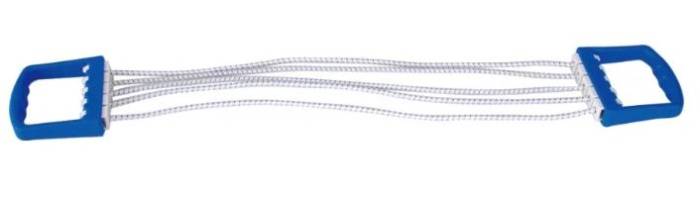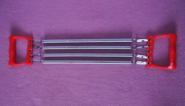 - Грудной — конструкция, состоящая из нескольких (чаще всего трех) жгутов и двух ручек. Жгуты обычно изготовлены из резины или резиносодержащих материалов, способных сопротивляться усилиям пользователя. Иногда грудные эспандеры оснащаются пружинами, полноценно заменяющими резину. Такой тренажер укрепляет мышцы спины, грудной клетки, плеч, трицепсы.