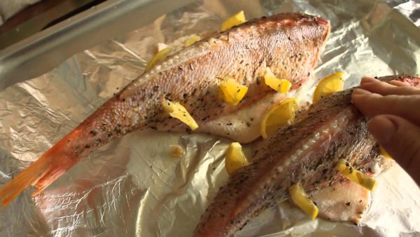 - Выложить на противень рыбу и налить теплой воды с добавлением растительного масла и нарезанного лимона.