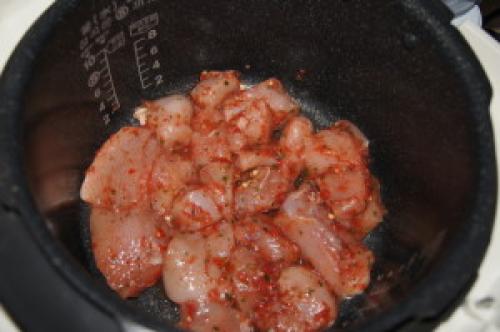- Далее выкладываем кусочки курицы, перемешиваем и оставляем обжариваться в том же режиме. Жарим около 15 минут, крышку прикрываем. Не забываем периодически перемешивать;