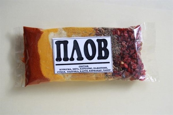 - Приправа «Айдиго», содержащая кумин с чесночными дольками, морковь с луком, куркуму с кориандром, базилик с красным перцем, а также барбарисовые ягоды с мятой. Одной упаковки весом в 30 г хватит для изготовления плова, в котором будут использованы 700 г риса и 700 г мяса.
