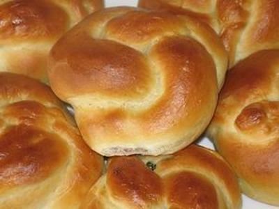 Если делаем булочки, то даем им время на расстойку (минут 20). Потом печем в духовке при 220 С до красивого колера. Печеные пирожки и булочки можно до выпечки смазать желтком, разболтанным с молоком.