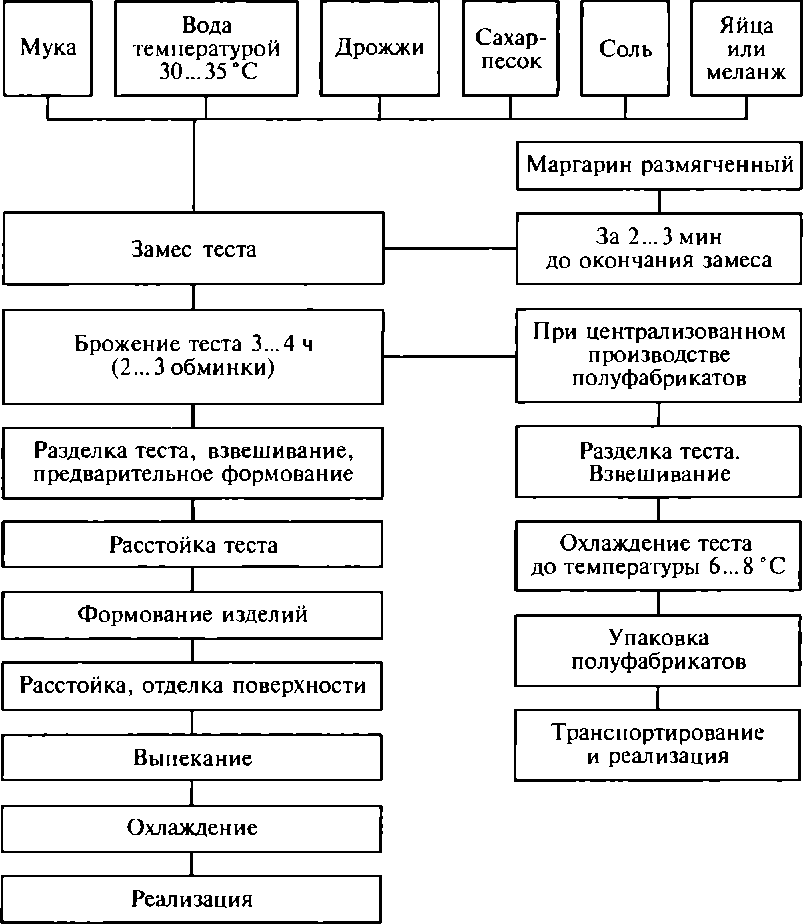 В воде, подогретой до 30 °С, растворяют дрожжи, соль, сахар, раствор процеживают через сито, затем кладут яйца и всыпают предварительно просеянную муку. Просеивают муку не только для того, чтоб очистить ее от загрязнений и комков, но и для того, чтобы обогатить муку кислородом для лучшего развития дрожжей. Тесто тщательно перемешивают вручную или в тестомесильных машинах, перед окончанием замеса добавляют растительное масло, при этом меньше разрушается клейковина. Готовность теста определяют по его однородности, отсутствию комков, кроме того, хорошо вымешанное тесто легко отстает от рук и стенок посуды.