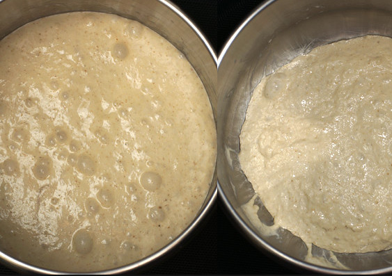Через 1,5−2 часа объем теста увеличится в 2 раза, тесто необходимо обмять в течение 2 минут. Тщательную обминку делают для того, чтобы тесто освободилось от излишков углекислого газа, чтобы дрожжи и молочно-кислые бактерии равномерно распределились в объеме теста.