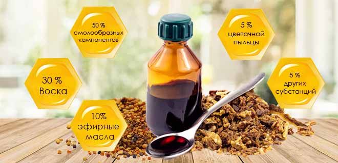 Прополис применяется в народной медицине с древнейших времен и именуется «пчелиным клеем». За счет своих полезных свойств продукт популярен как лекарство. Органический состав прополиса позволяет ему обеспечивать безопасность и безвредность в процессе практического применения. Большая доля веществ – смолы, на воск приходится 1/3 часть состава. Помимо этого, прополис содержит большое количество кислот: