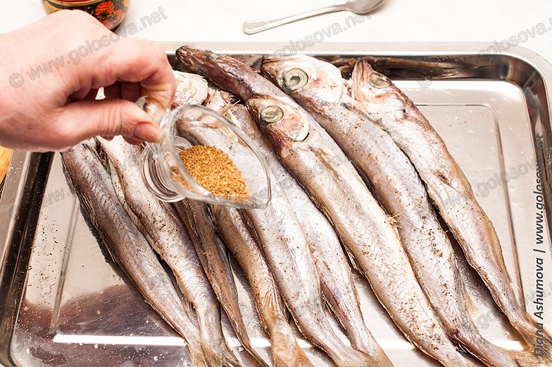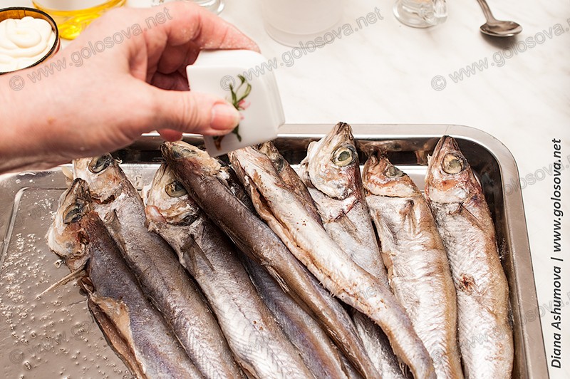 Потом каждую рыбку нужно немного смазать солью и перцем.