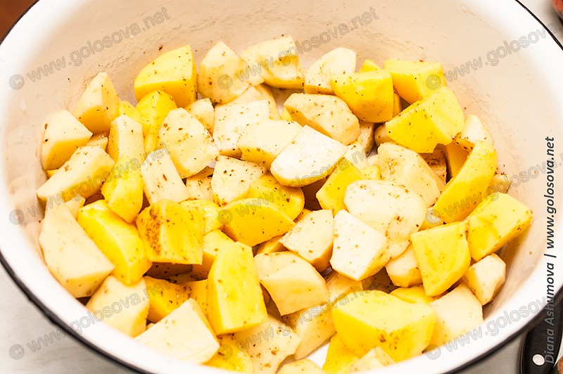 Затем путассу солим и перчим. Картофель нарезаем крупными кубиками, также не забудьте посолить и поперчить. Путассу будет готовиться довольно быстро, поэтому не стоит оставлять картофель целым или нарезать на половинки.
