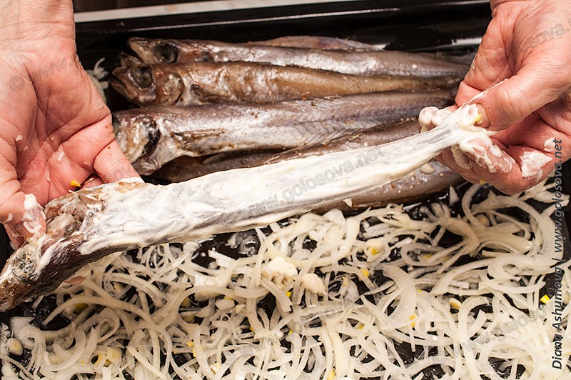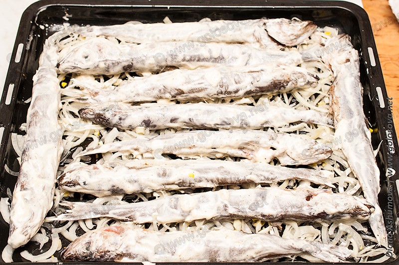 Покрываем противень половиной лука, каждую рыбку обмакиваем в майонез, который ей не даст высохнуть при приготовлении.