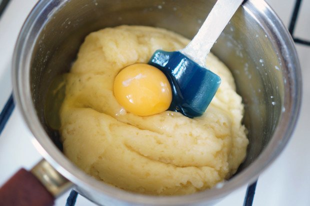Переложите заварившееся тесто в глубокую тарелку и начинайте вбивать в него яйца. Добавляйте очередное яйцо после того, как предыдущее полностью вмешается в массу. Получится воздушное и некрутое тесто.