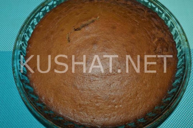 Выпекаем в течение 30-35 минут, до сухой шпажки. Готовый корж станет высоким и приобретёт светло-коричневую румяную корочку.