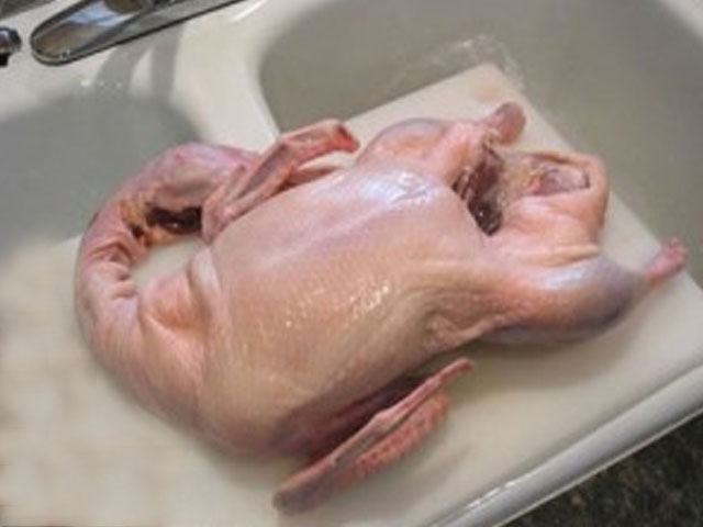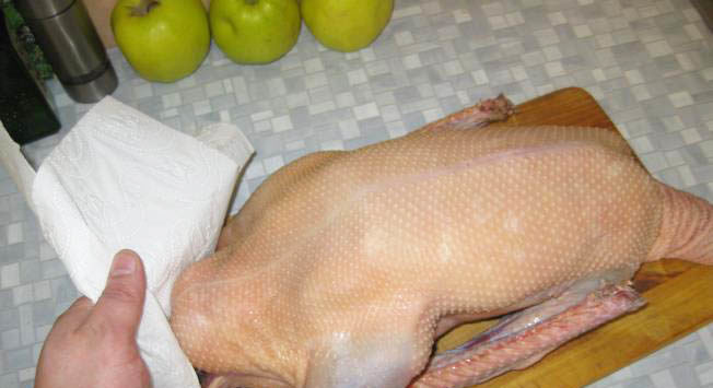 - Промойте гуся под проточной водой. Положите его на бумажное полотенце, чтобы стекла вся вода. Если на тушке есть пеньки, оставшиеся от перьев, удалите их ножом или пинцетом.
