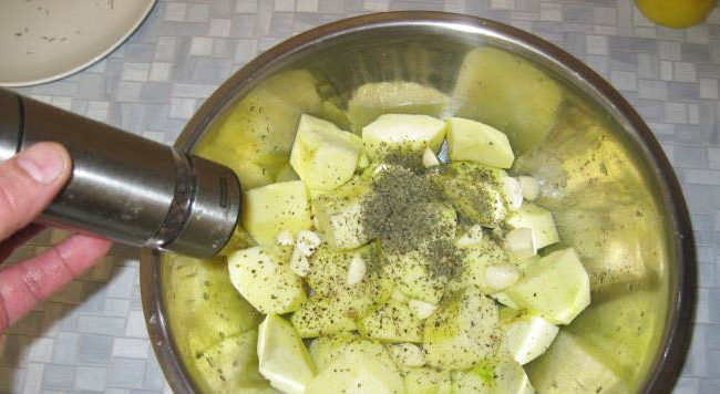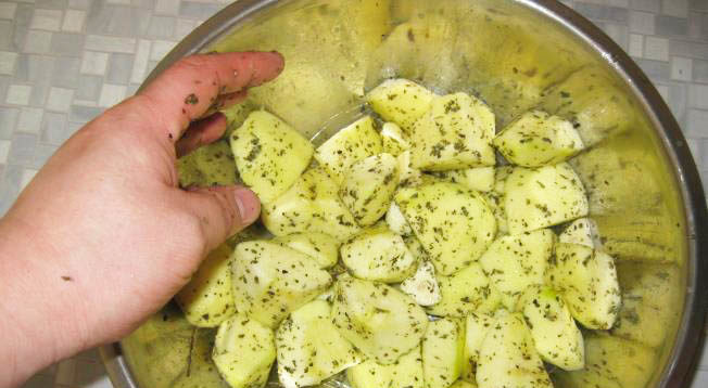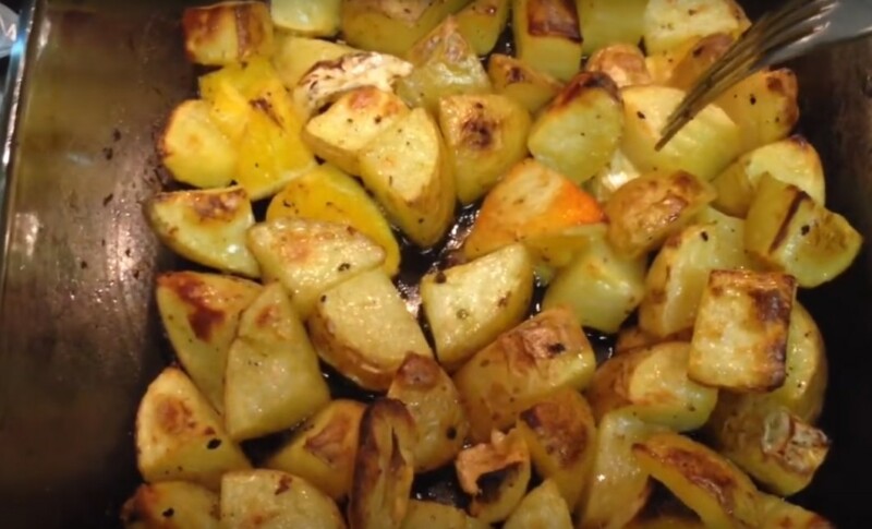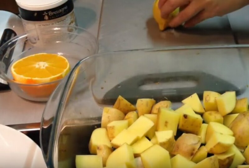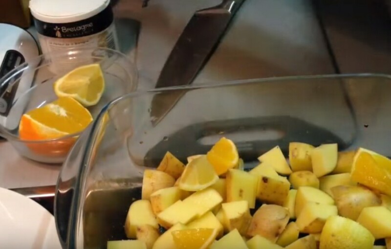 Для этого на противень наливаем пару ложек оливкового масла. Выкладываем также зубчики чеснока, придавив их плашмя ножом, чтобы выделился чесночный сок. Нарезаем картошку крупными кубиками, высыпаем на противень. Добавляем остатки лимона и апельсина.