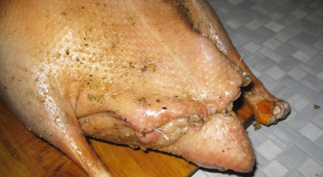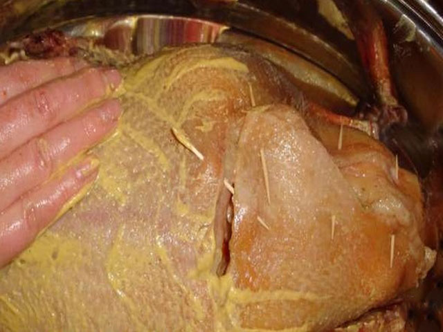- По истечении суток натираем птицу приготовленной смесью из перца, чеснока и горчицы. Оставим нашего гуся мариноваться при комнатной температуре на протяжении 2-3 часов.