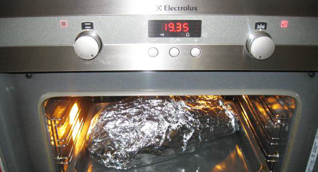 Готовить при 200°С около 60 мин, после снизить температуру до 180°С и продолжить запекание еще 2 ч.