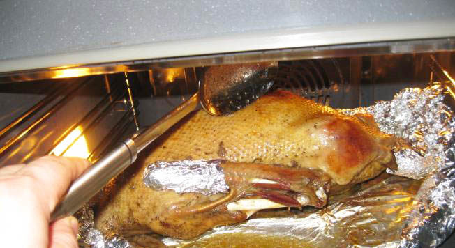 5. Укройте фольгой и выставите на противень. Духовку разогрейте до 180 градусов и зыпекайте 2 часа. После порвите фольгу сверху и обмажьте тушку выделившимся жиром. Вновь в открытом виде выставите в духовку. И так каждые 20 минут пропитывайте жирком. В итоге гусь должен просидеть в тепле 3-3,5 часа.