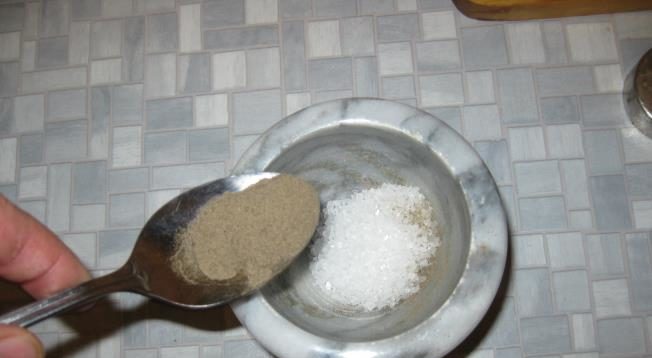 3. Возьмите ступу и насыпьте в нее соль, черный молотый перец и перец горошком.