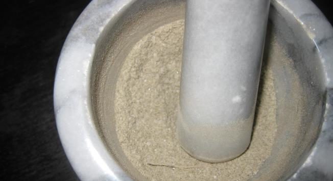 4. Затем положите травы и все разотрите до пылеобразного состояния.