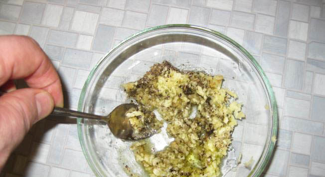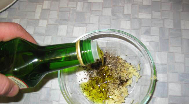 6. Теперь приготовим еще один маринад, для этого возьмите небольшую миску и выдавите туда половину зубчиков от почищенной головки чеснока, добавьте 1 чайную ложку ложку соли, 1 чайную ложку черного перца, и залейте небольшим количеством оливкового масла.