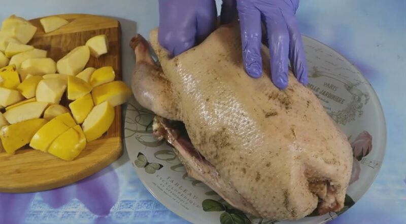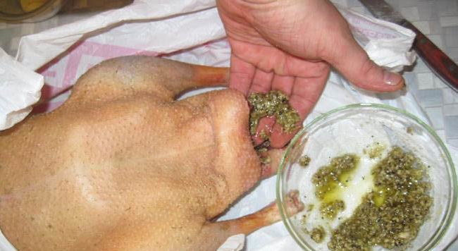 Промываем гуся, обсушиваем и промазываем смесью из измельченного чеснока, специй и соли. В таком виде на сутки оставляем его в холодильнике.