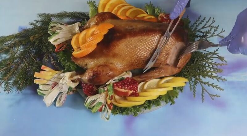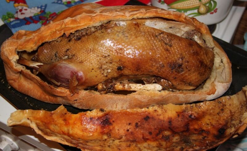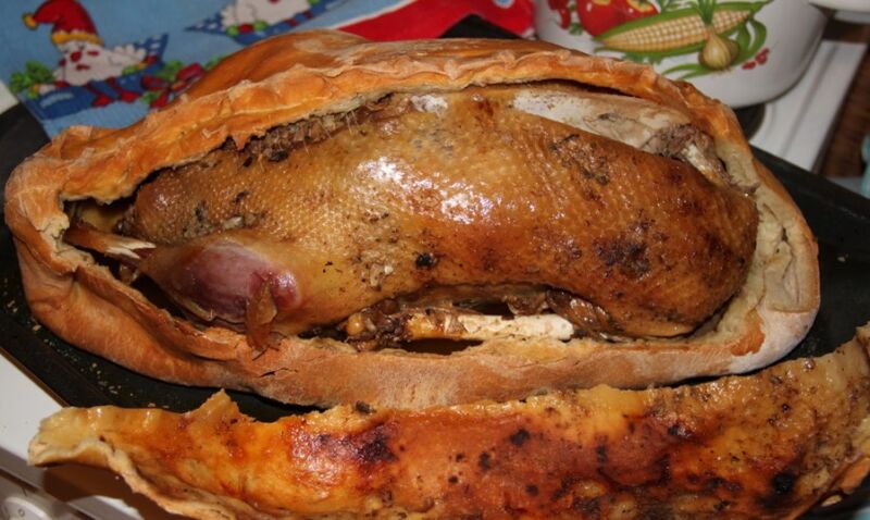 Пожалуй, самый необычный рецепт из этой подборки. Гуся можно запекать в тесте, вы знали об этом? При таком способе мясо получается сочным и готовится гораздо быстрее, чем в “чистом” виде.