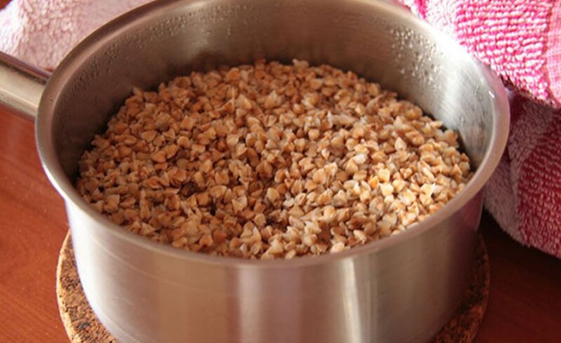 - Самое время заняться гречкой. Ее необходимо немного обжарить на сковороде, а после этого отварить до готовности. По окончании варки добавьте соевый соус и перемешайте.