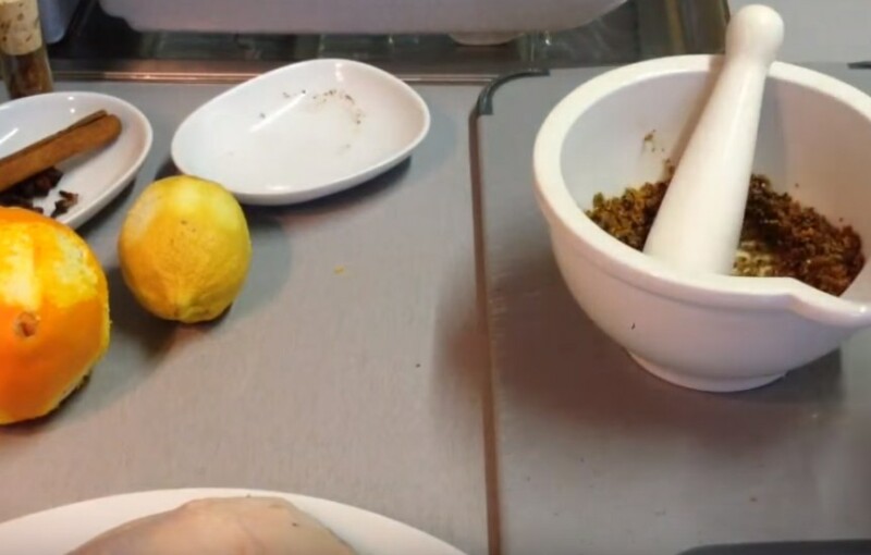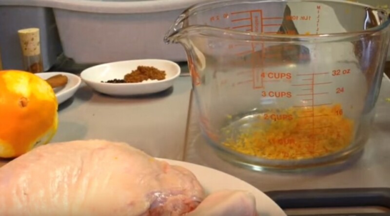 1. Начнем с приготовления смеси специй. Она должна содержать в себе цедру цитрусовых, чтобы уменьшить жирность и помочь выщеплению жиров в процессе приготовления, а также придать неповторимый вкус и аромат. Стараемся натирать только желтую кожурку без горькой белой части.