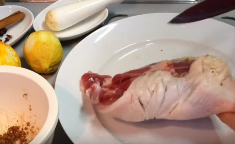 3. Подготавливаем ножки гуся. Острым ножом аккуратно надрезаем кожу на самых жирных частях, не доходя до мяса. Это поможет вытопить излишний жир, а также специи смогут лучше пропитать нашу птицу.