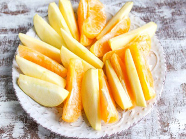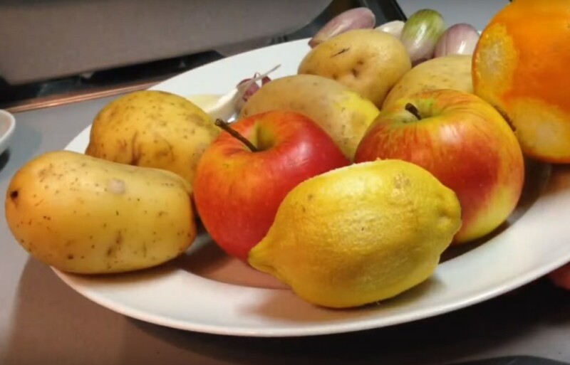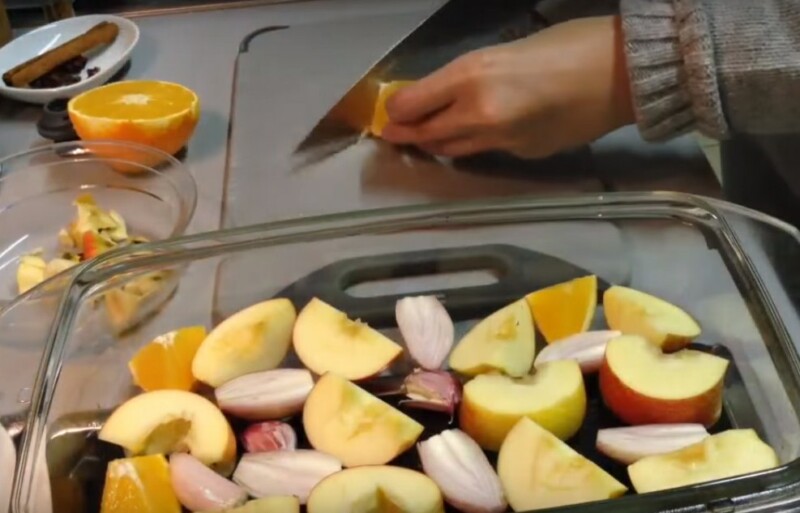 6. На противень для выпекания выкладываем нарезанные дольками яблоки, апельсины, лимоны, лук и чеснок.