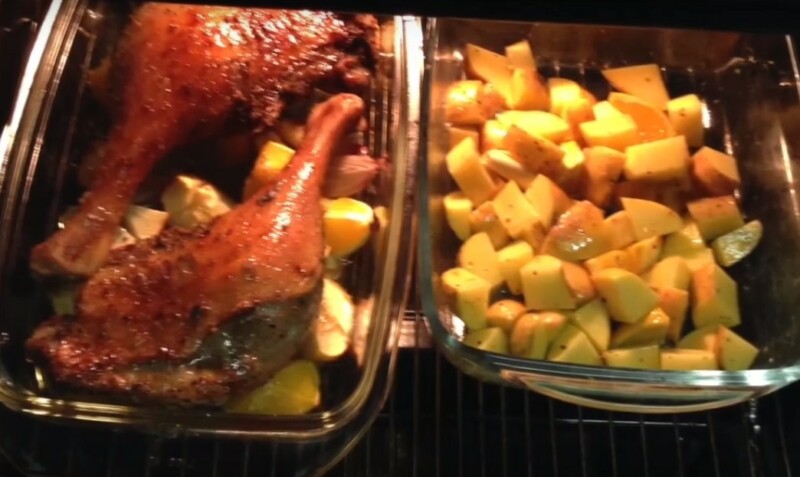 10. Добавляем пару ложек вытопившегося гусиного жира, солим, перчим. Ставим в духовку выпекаться до готовности, рядом с ножками.
