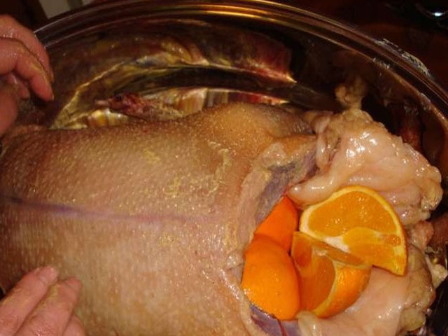 Нафаршировать тушку дольками апельсина, скрепить прорезь зубочистками или нитками, чтобы при выпекании шкурка не разъехалась.