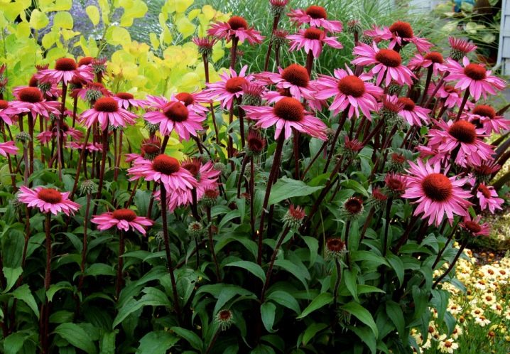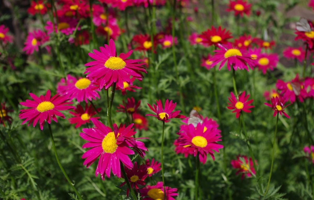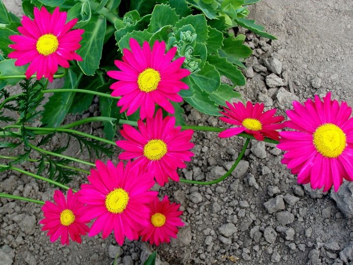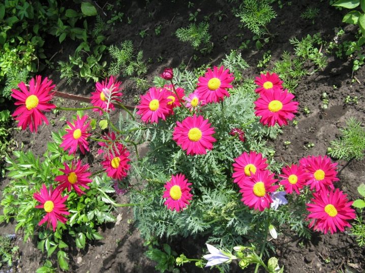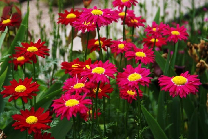 Пиретрум красный. Его называют красной ромашкой, соцветия небольшие, лаконичные, листва обыкновенная. Несмотря на скромный внешний вид, это растение великолепно смотрится в садовых группах и композициях. Это цветущий кустарник травянистого типа, высота может варьироваться от 60 до 90 см. Стебель мощный, прямостоячий, несмотря на габаритные соцветия, не сгибается. Листва имеет сочный зеленый цвет, серединка цветков выпуклого типа, желтая и плотная. Лепестки красноватые, что понятно из названия, они формируют несколько рядов, по типу хризантем, корни ползучего типа. Неприхотливое растение, которое, однако, быстро выгорает под солнцем.
