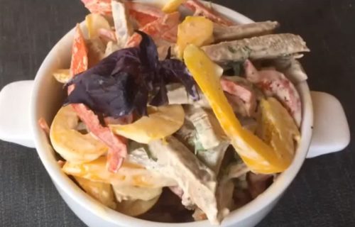 По сути, салат состоит из трех простых ингредиентов, но весь смак таиться в потрясающем маринаде для мяса. Благодаря ему получается просто волшебная закуска. Салат относится к разряду «горячих».
